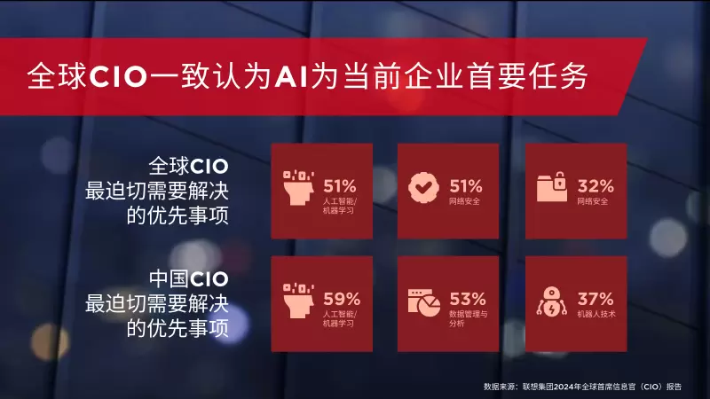 2024年4月25日,联想集团发布以“直勘创新暴风眼:看人工智能如何重塑企业IT”为主题的2024年全球首席信息官(CIO)报告,这也是联想连续第三年发布CIO报告。报告显示,人工智能是当今企业首席信息官(CIO)们的首要任务,虽然他们迫切希望进一步扩大人工智能的应用,但却受到速度和安全性等因素制约,企业内部其他职能部门也尚未做好准备。