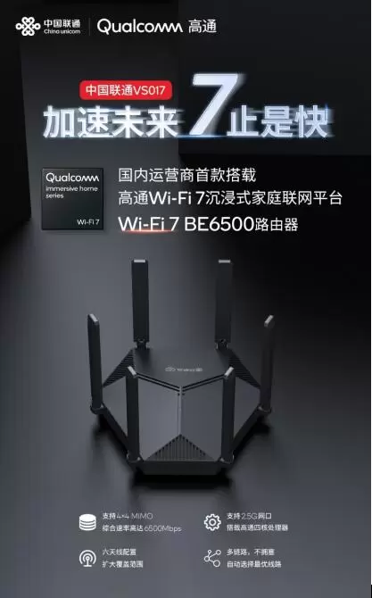 近日,高通技术公司与中国联通携手打造的全新路由器产品——中国联通Wi-Fi 7 BE6500智能路由器VS017正式上市,这标志着双方在技术创新方面的持续合作,旨在为用户提供全新的网络连接体验,这也是中国联通积极推动技术自主创新、优化用户体验、不断扩展数字经济领域的重要举措之一。