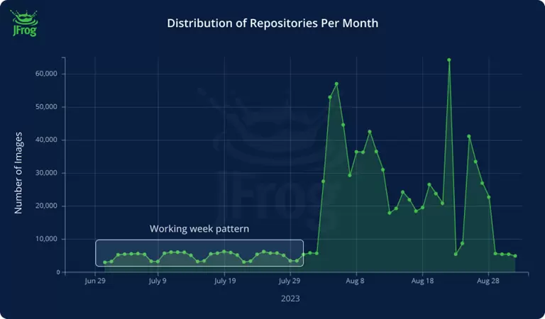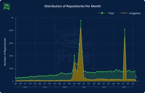 识别恶意存储库JFrog首先从Docker Hub存储库的发布模式中发现了异常。为此,我们调出了过去五年中发布的所有“无镜像”Docker Hub存储库,按创建日期进行分组,并将其绘制成图表: