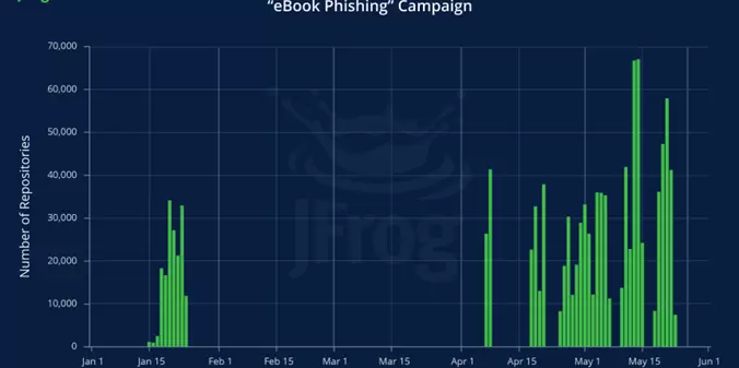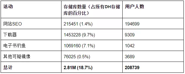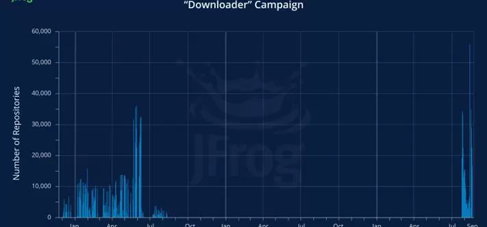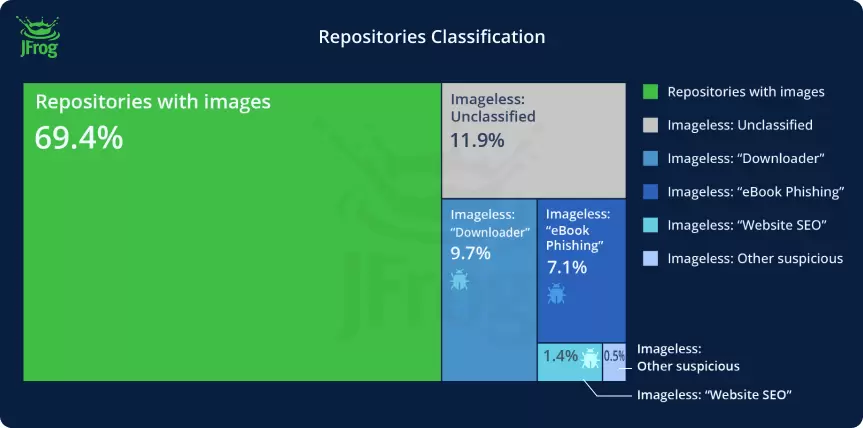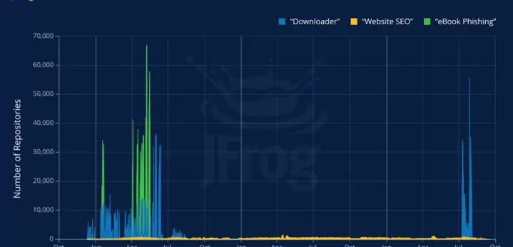 然而,这些公共存储库的内容却出现了一个重大问题。JFrog研究显示,这些公共存储库中有近20%(近300万个存储库!)托管过恶意内容,包括通过自动生成的账户上传的用于推广盗版内容的垃圾邮件,以及恶意软件和钓鱼网站等极度恶意的实体。