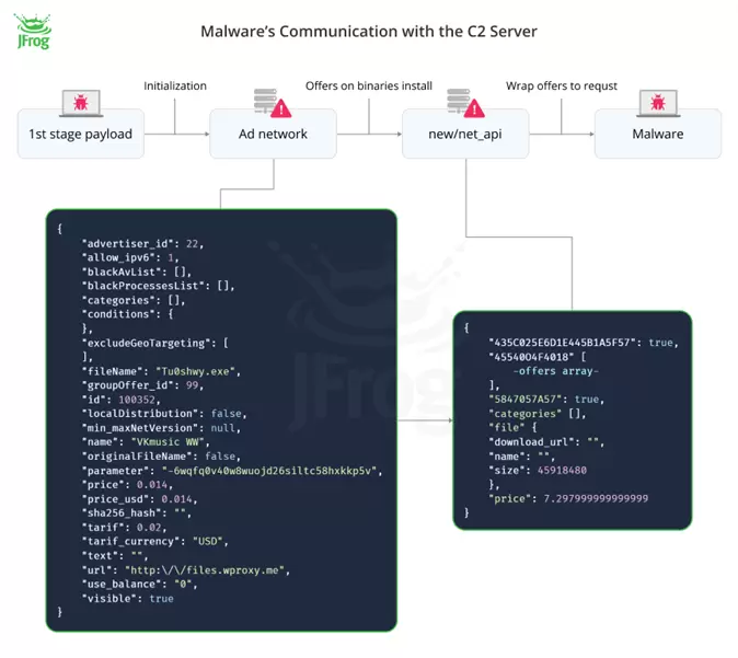 考虑到恶意软件已经向服务器发送了系统信息,这些条件在客户端上略显多余。此外,响应中还包含了二进制恶意软件中从未使用过的字段,但却是广告网络的典型字段,如price、offer_id和advertiser_id。从这些字段中,我们可以推测该恶意软件操作是更广泛生态系统的一部分,可能涉及广告软件或变现方案,这些方案从第三方软件的分发和安装中获益。基于这一认识,我们进一步假设这些请求参数很可能是从可疑的广告网络API复制并嵌入到软件中的,第三方可能会付费分发其可执行文件。