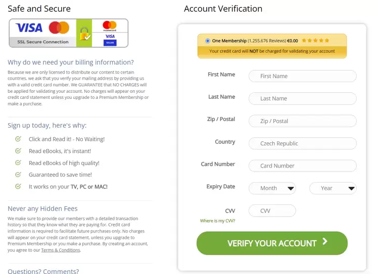 在承诺免费提供完整版电子书后,网站会从用户IP可用的页面集中随机选择一个页面,并将用户重定向到该页面。接下来的步骤取决于用户所在的国家,但通常会出现要求用户输入信用卡信息的表单。