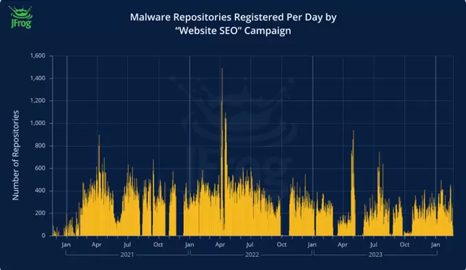 其中两个活动在2021年上半年最为活跃,每天发布数千个存储库。下载器活动在2023年8月又进行了一次尝试。网站SEO活动的运作方式与之不同,三年来始终坚持每天推送少量存储库。