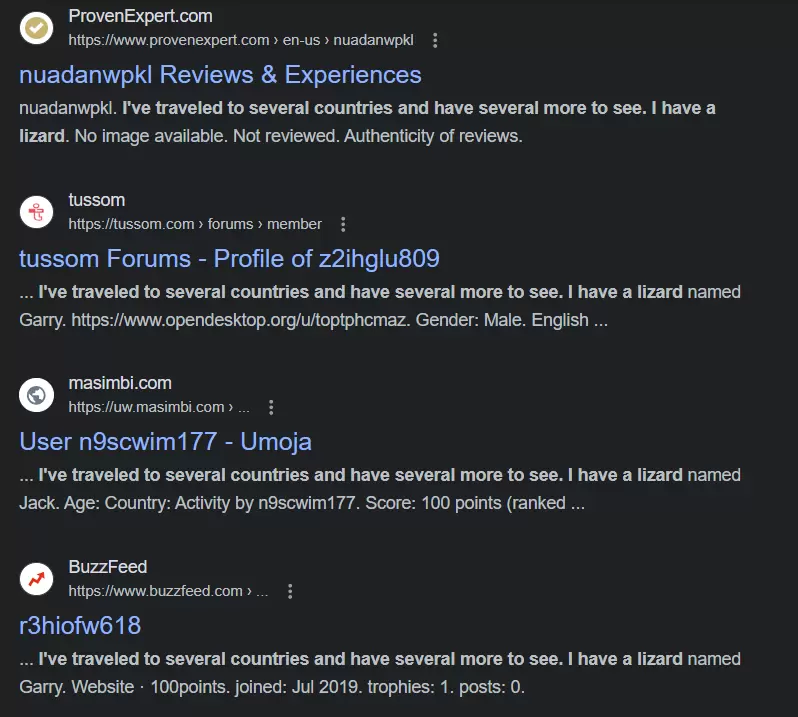 3.“网站SEO”活动与前两次公然恶意(网络钓鱼/恶意软件下载)的活动不同,这次活动的目的并不那么明确。虽然存储库本身显然不是出于善意上传的,但其内容大多无害——只是一个随机描述字符串,其用户名由“axaaaaaxxx”模式生成,其中a是字母,x是数字。这些用户发布的所有存储库都有一个相同的名称:网站。