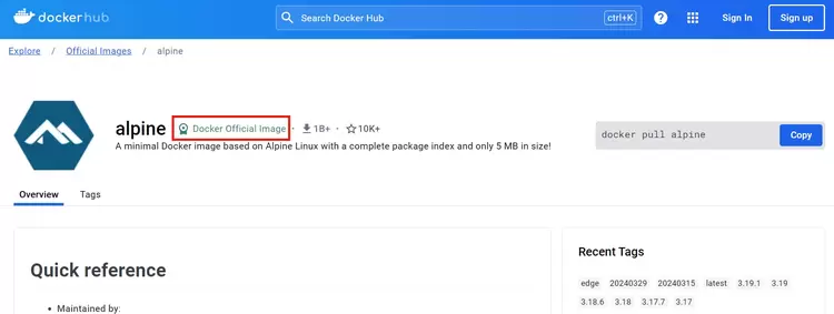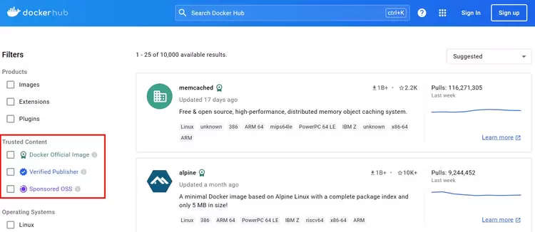 Docker Hub为受信任的内容设置了特定标签,用户在浏览镜像描述页面时可以查找这些标签。第一个标签是官方Docker镜像标签,也称为Docker Hub库,这是一组经过精心挑选的Docker存储库。该库包含由受值得信赖的知名软件开发基金会、组织和公司维护的存储库,例如Python、Ubuntu和Node。第二个标签“已验证发布者”(Verified Publisher)标签,该标签分配给Docker验证发布者计划(Docker Verified Publisher Program)中的每个存储库。这一组包含来自商业发布者的存储库,这些发布者已通过Docker Hub的验证。同时,具有Sponsored OSS标签的内容,则是由Docker Hub赞助的开源项目存储库。