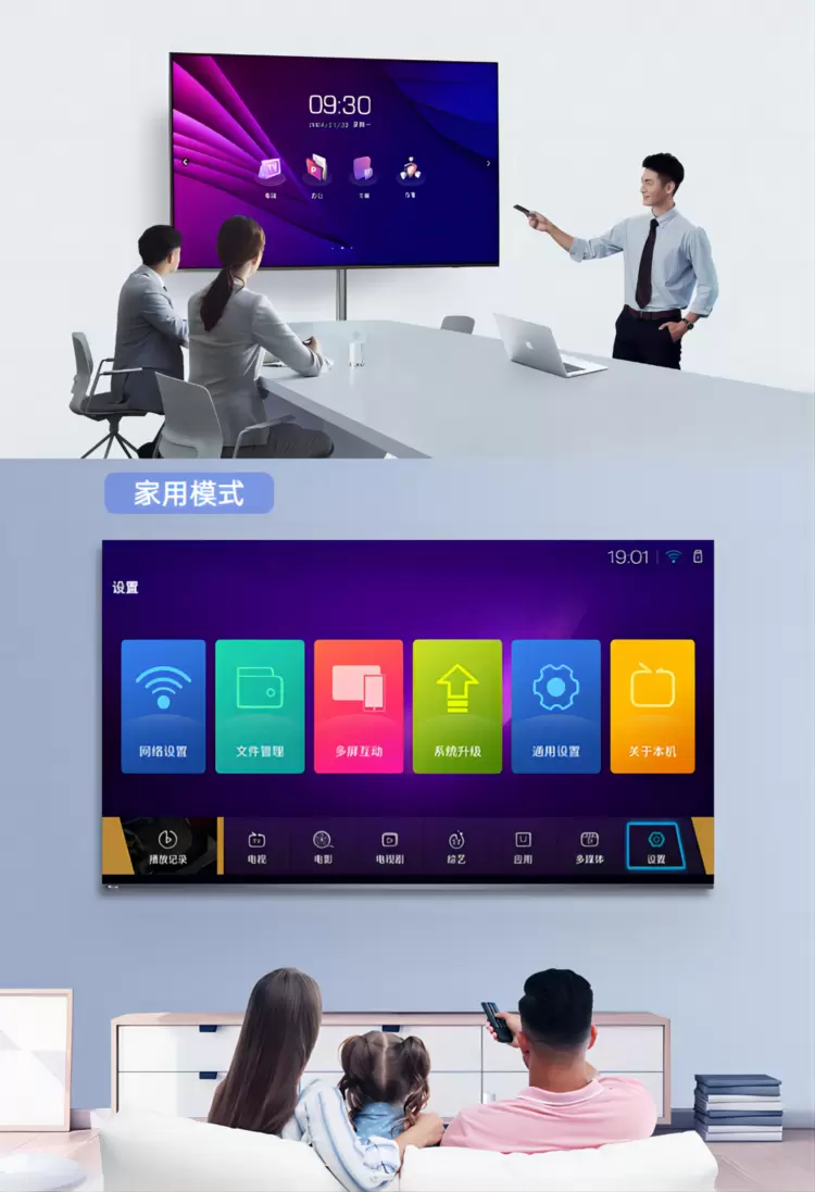 皓丽会议电视创新双模式设计,可以实现“会议模式+电视模式”两种模式的灵活切换。会议模式下,大屏会议、大屏演讲等,专业会议系统,专注高效会议;电视模式下,大屏观影、大屏游戏等,享受全面屏的沉浸式体验。这样,工作娱乐一机两用,很好的兼顾了会议室和家庭使用。