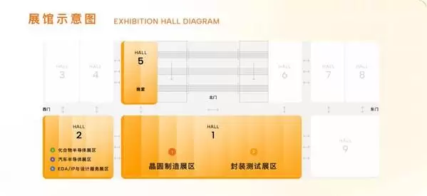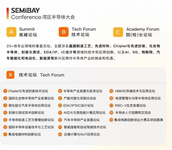 五大展览专区:晶圆制造、封装测试、化合物半导体、汽车半导体、EDA/IP与IC设计湾区半导体大会:开幕式暨高峰论坛、技术论坛、院(校)长论坛