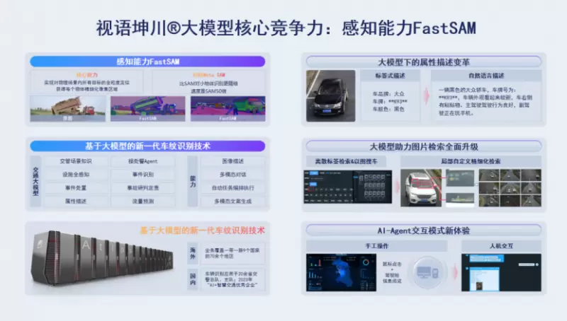 赵旭博士重点介绍了中科视语基于视语坤川®大模型打造的视语坤川®交通大模型。他表示:“视语坤川®交通大模型基于大模型的新一代车纹识别技术采用了行业领先的华为昇腾全国产自研方案。能力包含图像描述,多模态对话和自动任务编排执行等,应用场景覆盖交管行业知识,接处警升级,道面设施全量感知以及流量精准预测等。基于新一代车纹识别技术的交通解决方案革新了交通产品的新体验,实现了从标签式到自然语言式的属性描述变革。基于大模型的局部检索技术将离散标签式的检索模式全面升级为局部自定义的精细化检索方式”。