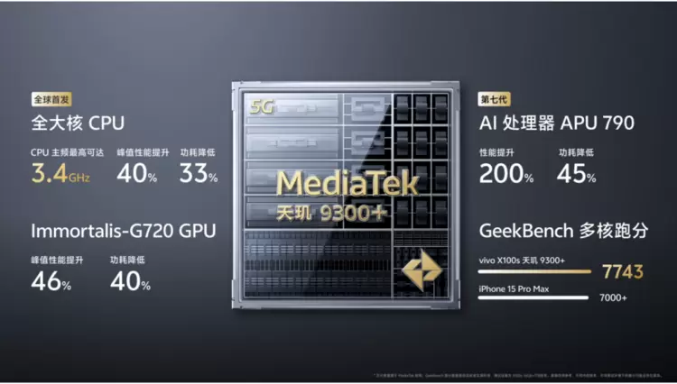 vivo X100s不仅颜值出众,而且性能强悍。其全球首发搭载天玑9300+旗舰平台,通过蓝晶芯片技术栈联合研发与调校,使性能再度跃升,全大核CPU峰值性能提升40%,功耗降低33%,GeekBench多核跑分达到7743分,安兔兔跑分直破230万,让vivo X100s直封当前手机市场直屏旗舰的性能杰作。
