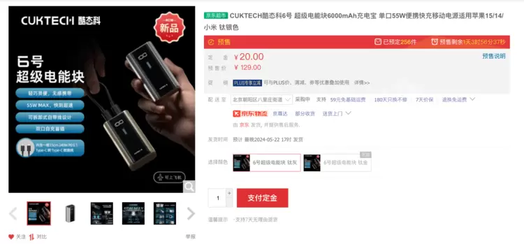 5月13日,小米生态链品牌CUKTECH酷态科官宣旗下数字旗舰系列新品——6号超级电能块,上架现金预售,首发售价129元。