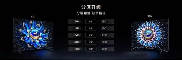 众所周知,分区升级是画质提升的关键,分区越多,精细控光的能力会更强,呈现的画面细节也会更丰富、逼真。此次的T7K配备了同价位产品少有的Mini LED技术,将更小的微米级Mini LED灯珠均匀分布在屏幕背面,并使用了TCL的透镜技术,同尺寸下分区数量较之前提升最多可达3倍,最高拥有960个Mini LED分区。