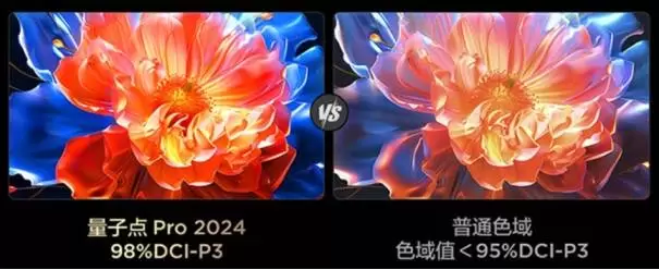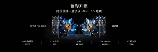 拥有98%(DCI-P3)量子点广色域,采用升级版的四元量子晶体Pro,保证10万小时有效发光,获得更优秀的光学和色彩属性,呈现出更加通透自然的色彩。