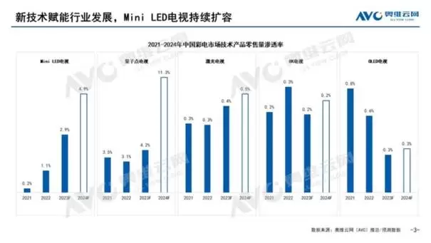 有关市场分析师指出,在全球高端电视市场一直是以OLED电视和Mini LED电视两大阵营为主导。然而,自去年开始,Mini LED电视销量呈现近4倍的同比增长,市场占有率更是达到了OLED电视的8倍,彰显其在高端电视市场中的主导地位。据行业机构TrendForce集邦咨询所发布的预测数据显示,2023年全球Mini LED电视的出货量将达440万台,而到2024年,Mini LED电视出货量将持续增长,预计可达621万台,年增长率达53.5%。