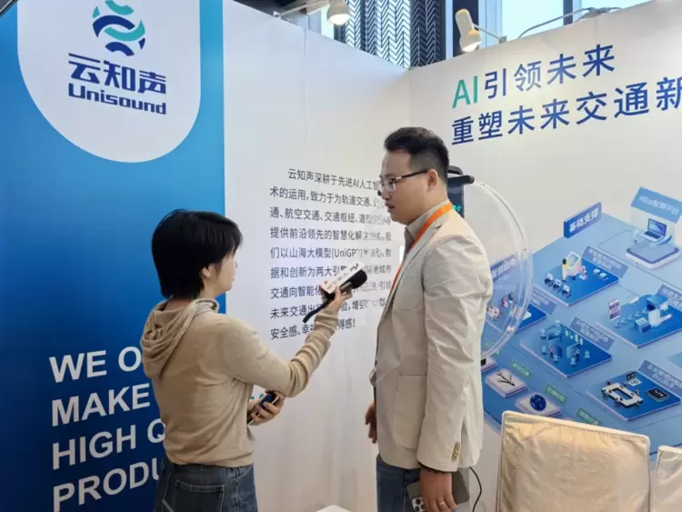 大会期间,云知声智慧交通系列产品亮相展会,其赋能青岛地铁打造的数智客服系统以其新颖的3D全息效果和多模态交互能力吸引了诸多参展嘉宾驻足观看;宁波官方广播电台《宁波之声》莅临展位进行现场采访,深入了解云知声技术成果和市场潜力。