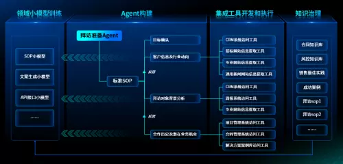用户根据需要可以呼唤出辅助工作的智能体,比如拜访智能体我们叫智小访、当销售人员要去拜访客户之前,告诉智小访,“请帮我准备周五拜访客户所需的材料”。