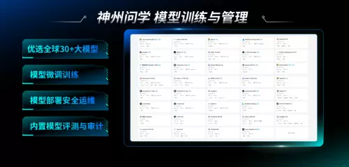 神州问学的大模型管理平台内置了精选的全球数十种基础大模型,搭配用户业务测试框架,为企业提供了一个全面评估模型性能的平台。通过直观的控制面板,算法团队能够实时监控训练进度,灵活调整训练策略,快速迭代模型,达到最佳性能。这一特性不仅缩短了模型从实验室到生产环境的路径,也为企业持续优化私有模型集群、构建私域知识体系提供了强大支撑,加速了AI创新的规模化应用。