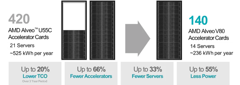 图3:AMD Alveo V80 加速卡实现的预估传感器处理和 TCO 节省②(参见尾注 ALV-16②)