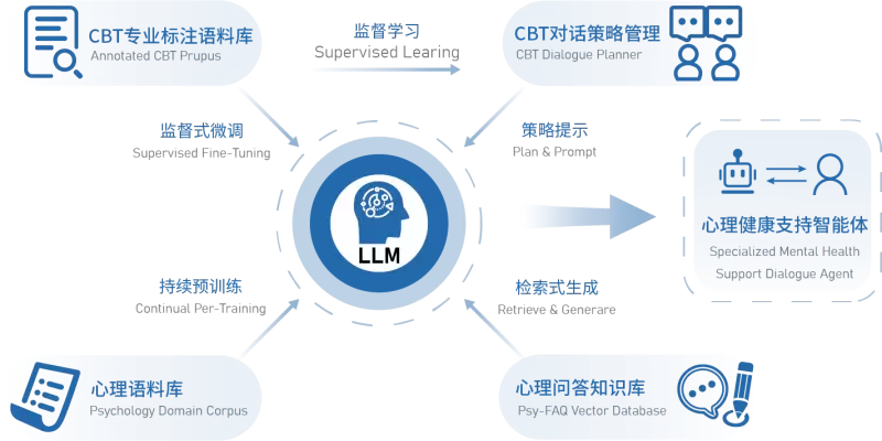 那么,在精准的心理评估数据验证下,对于心大陆所要赋予的数字心理健康全流程陪伴闭环是远远不够的,还要有共情陪伴及专业疏导等,因此,心大陆的专家们同步投入了“心理垂直领域对话技术”的探索,传统的CBT是一种冷冰冰的机器语言行为,缺乏与人类的情绪共鸣和思想融合,因此,心大陆需要将这位“咨询师”改造成“说人话、说准话、说对话”,这无疑又是一项重大的研发课题,但是心大陆无所畏惧,越是挑战越有激情!作为一个心理陪伴咨询师,他们需要训练机器人能够有一个引导用户倾诉心声的思想,并通过疏导语言去进行对话,使人类得到心灵上的发泄并得到精准的疏导诊断。研发团队在基于Llama2中文基座模型这个“大脑”上,一方面通过数千万字中文心理专业书籍内容增量预训练Llama2,使“咨询师”拥有丰富的专业知识,另一方面, 通过数万段CBT认知行为疗法专业对话语料库监督微调Llama2,同时运用高质量的标注数据集监督学习CBT对话策略管理为Llama2输送策略提示,并借助心理问答知识库让“咨询师的脑海里”能够随时获取应对内容,这是心大陆另一个“0-1”的突破。