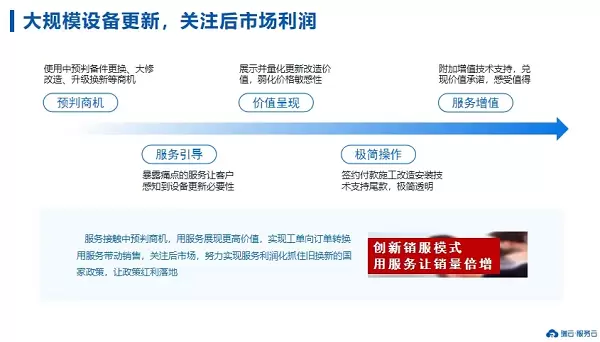 接下来就是服务引导,这是更新换新的关键步骤,因为这个时候客户根本不像更新升级,所以引导过程更具挑战。与消费品企业不同,大规模设备企业更注重投资回报和成本控制,更换零件升级改造往往被视为不必要的支出。因此,我们不能仅仅只是提供维修服务,而是要暴露设备的痛点,让客户深刻感知到设备更新改造的紧迫性和益处。