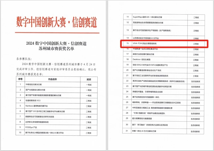 近日,由数字中国建设峰会组委会主办,福建省数据管理局、福建省工业和信息化厅等单位共同承办的“2024数字中国创新大赛·信创赛道”苏州城市赛圆满落幕。凯美瑞德申报的“VIVA-TCM资金交易管理系统”经过激烈角逐与严格评审,荣获本次大赛三等奖。