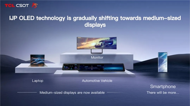 以领先技术与应用优势为依托,TCL华星印刷OLED技术推广重心主要在中尺寸显示领域,如商用、电竞显示器,笔记本显示屏,以及医疗、车载、工控等差异化产品,未来可扩展到平板,手机等领域。