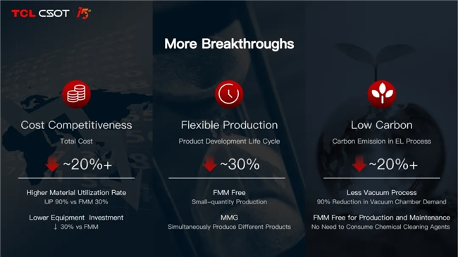 效率提升,成本可控。通过喷墨打印技术控制的精确喷墨,TCL华星印刷OLED可以实现90%以上材料利用率,最大限度减少材料浪费。同时,印刷技术在设备投资方面也有明显的优势。