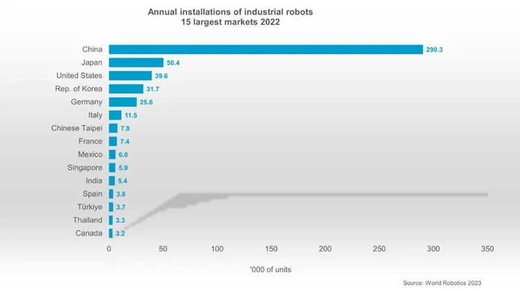根据国际机器人联合会(IFR)发布了《2023世界机器人报告》。《报告》记录了全球工厂安装的工业机器人数量为553,052台,同比增长5%。按地区划分,新部署的机器人中有73%安装在亚洲,15%在欧洲,10%在美洲。