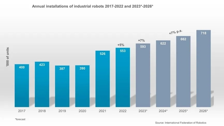 “连续第二年打破了50万台的世界纪录,”国际机器人联合会主席玛丽娜比尔说。“到2023年,工业机器人市场预计将增长7%,全球将超过59万台。”