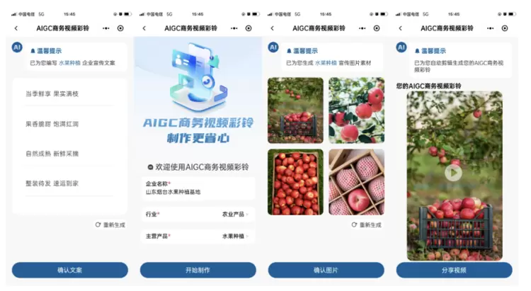 小微商户、农户等客户群体不用再提供详细宣传文案及图片等素材,只需要输入商户名称、产品素材等简单操作,AI就能快速制作一段精美的企业和产品宣传短视频,可分享至朋友圈宣传或设置成视频彩铃,打开企业商户数字化营销新思路。
