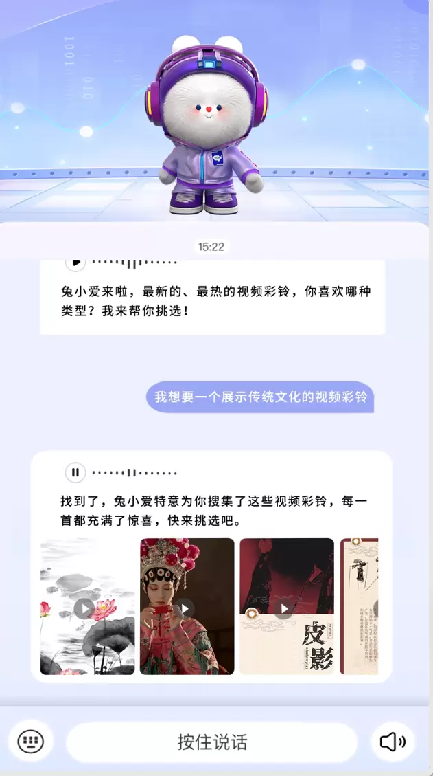 通过AI视频理解模型,AI彩铃搜索助手对曲库内上百万视频彩铃进行内容分析,生成文段式标签;并基于星辰语义大模型实现多轮对话;通过语音语义分析,将用户的搜索要求扩写为文段描述,与曲库进行匹配,使得AI彩铃搜索助手能够快速、精准地提供最贴近用户真实需求的推荐内容及搜索结果。
