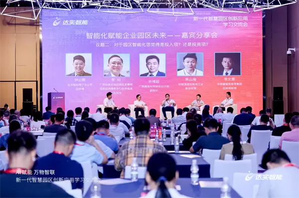 在随后的嘉宾分享环节中,达实智能南宁分公司总经理钟云南作为主持人,与广西壮族自治区园区发展和投资促进服务中心投资促进一处处长黎明、广西建筑科学研究设计院副院长许维超、防城港澳加粮油工业有限公司副总经理焦山海、华保盛服务管理集团有限公司总经理助理李文震,围绕“智能化赋能企业园区未来”展开了精彩对话与分享。