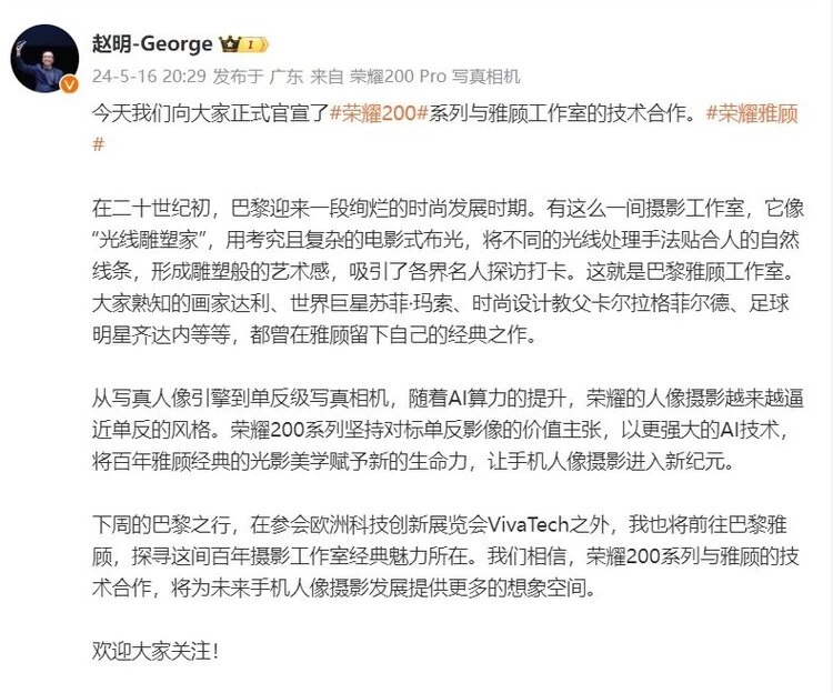 荣耀CEO赵明对此次与雅顾合作充满自信与期待,连续发微博表示“AI科技与光影美学在荣耀200相遇,人像写真将焕发全新精彩!”“荣耀200系列坚持对标单反影像的价值主张,以更强大的AI技术,将百年雅顾经典的光影美学赋予新的生命力,让手机人像摄影进入新纪元。”结合荣耀数字系列在影像方面的出色表现,以及荣耀长期以来在AI能力上的沉淀,有理由相信荣耀200系列会为手机人像摄影发展提供更多的想象空间。