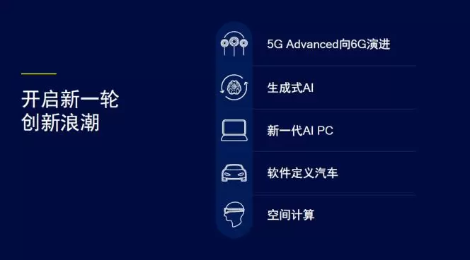 我们看到,近年来,颠覆性的科技创新成果不断涌现,这为发展新质生产力提供了重要的基础,也助力开启新一轮创新浪潮,包括5G Advanced向6G演进;生成式AI为各行业带来广阔机遇;AI PC将生产力提升到全新的水平;软件定义汽车重塑驾乘体验;以及空间计算加速融合物理和数字世界等等。