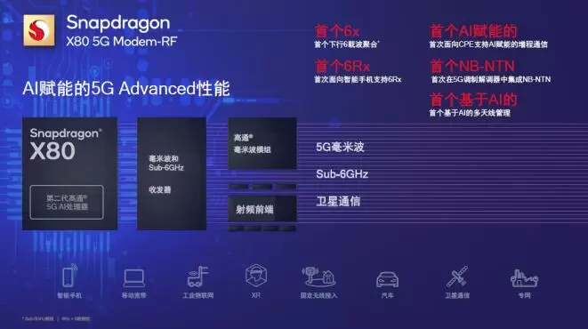 在今年MWC巴塞罗那上,高通公司推出的全新5G调制解调器及射频系统——骁龙X80,就是我们将前沿AI和无线连接技术相融合的最新成果。骁龙X80集成专用5G AI处理器和5G Advanced-ready架构,实现了多项全球首创的里程碑,包括首次面向智能手机支持6路接收、首个下行六载波聚合等,带来全新水平的5G性能和体验。