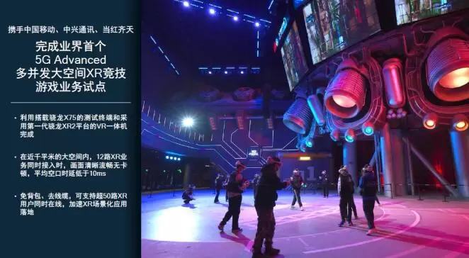 技术创新也为XR产业带来了前所未有的机遇。今年2月,我们携手中国移动、中兴通讯和当红齐天,完成了业界首个5G Advanced多并发大空间XR竞技游戏业务试点。该验证利用搭载高通解决方案的终端,在近千平米的大空间内,12路XR业务同时接入时,画面清晰流畅无卡顿,平均空口时延低于10ms,免背包、去线缆,可支持超50路XR用户同时在线,扩展了XR场景化应用空间。