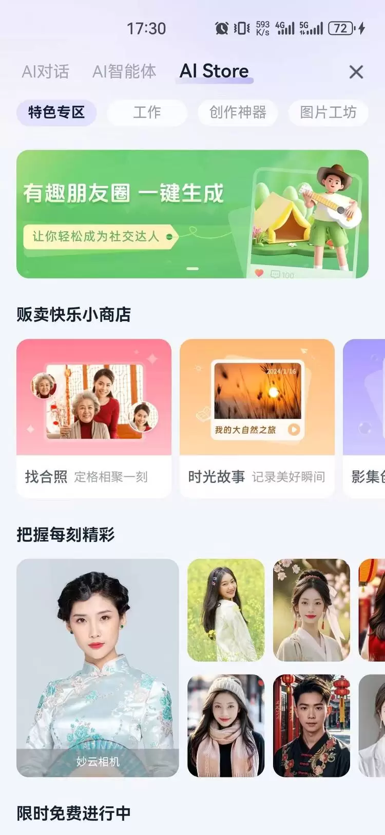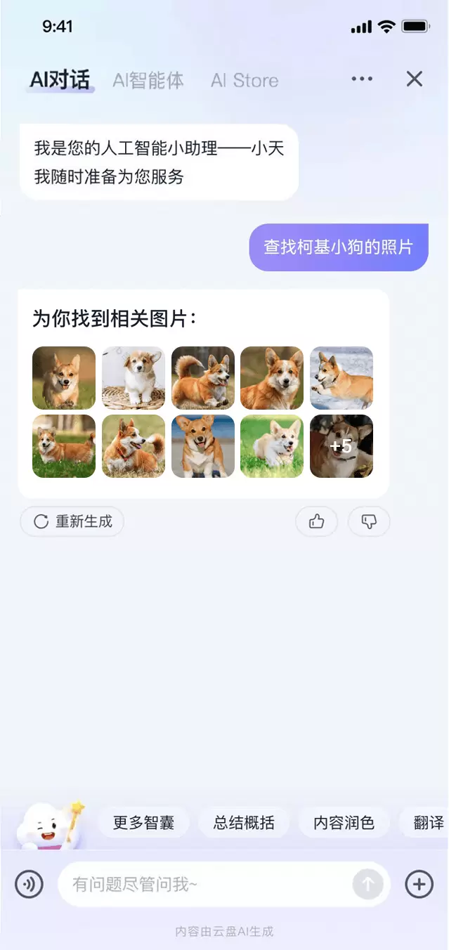 体验AI智能体多元互动场景,感受百变IP聊天室,还有AI Store多款特色工具一站畅享。在与AI的互动中,可选择多款IP人格进行体验,沉浸式对话,与AI智能体开启嗨聊模式。在AI Store里,多款工具覆盖用户工作、生活、学习等场景。在工作专区,可使用语音转写、文字识别等工具,一键提高办公效率;在创作方面,可找到所需要的定制场景让AI协助撰写文案,生成广告创意、活动总结、朋友圈文案等,快速寻找创作灵感;在图片工坊,为用户提供文生图、图片漫画风、老照片修复等应用服务,照片处理更有趣味性。全新AI云盘提供更加智能、便捷和个性化的服务,为用户带来更加趣味、流畅的使用体验。