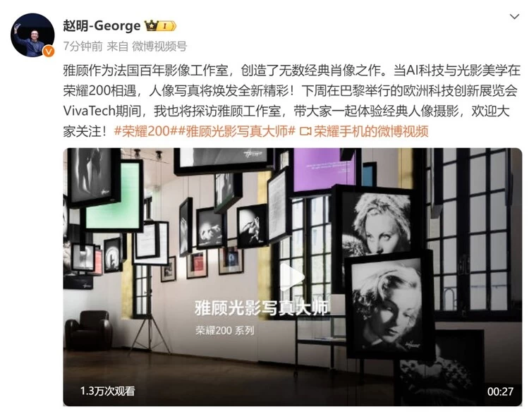 5月16日,荣耀官方宣布与巴黎雅顾摄影工作室(下文简称雅顾)展开深度的影像技术合作,为荣耀200系列带来全新的影像升级体验。当天,荣耀CEO赵明在微博中发布视频并配文称:“雅顾作为法国百年影像工作室,创造了无数经典肖像之作。当AI科技与光影美学在荣耀200相遇,人像写真将焕发全新精彩!”。”这表明,荣耀数字系列将继续深耕写真人像赛道,通过技术驱动经典来缔造新的光影经典。