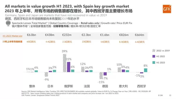 钟峤峤介绍道,镜片市场分区域来看,GfK全球市场监测数据显示,去年全球大多数地区镜片市场呈现正增长态势,上半年西班牙市场的同比增速最快,达到8%(以欧元计)。