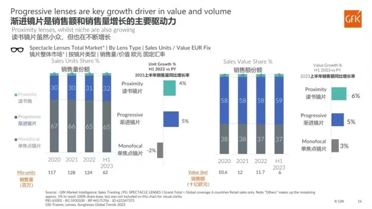 细分品类来看,渐进镜片是全球镜片市场增长的主要驱动力。2023年上半年,全球市场渐进镜片的销售额和销售量均同比增长了5%(以欧元计,本段同);同时,目前尚属小众品类的读书眼镜销售额和销售量也分别增长了6%和4%。