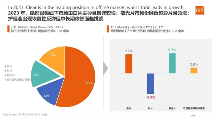 细分品类方面,2023年的线下市场由白片主导(销售额份额达到55%)(以人民币计,本段同)且增速较快;散光片市场份额(15%)超过了彩片(14%),且同比增速在细分品类中位列第一(+9.7%)。
