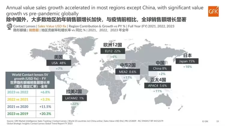 隐形眼镜市场方面,去年的市场规模也出现了显著同比增长。拉丁美洲市场的销售额同比增速达到22%(以美元计,本段同),中东市场增速也达到了17%。相比之下,中国市场去年的表现较为平稳,同比增速在2%左右。