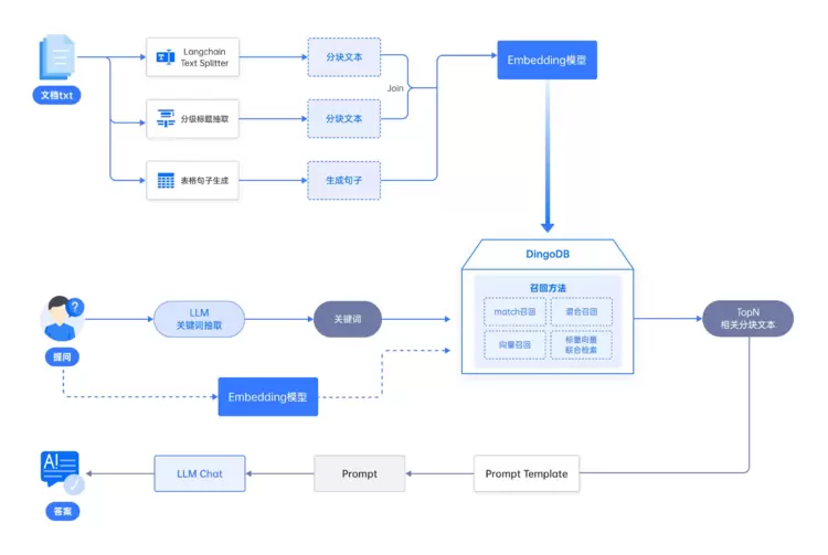 用户提出问题后,通过Embedding模型生成向量表示,在DingoDB中进行向量检索,找到最相关的多个文本块。关键词检索是为解决用户口头表达与专业文档不匹配而造成的检索不准确问题。关键词检索通过LLM提取关键词,输入DingoDB进行关键词匹配(match召回),找到相关文本块。DingoDB支持标量向量联合检索,结合关键词匹配和向量召回进行混合召回,返回TopN相关文本块。