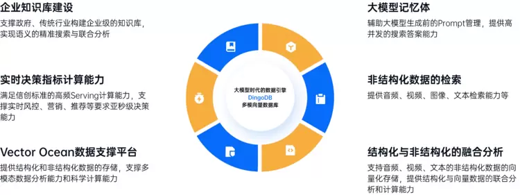 ●Vector Ocean数据支撑:Vector Ocean是九章云极DataCanvas对数据架构的一种全新设想。DingoDB在Vector Ocean中提供结构化和非结构化数据的存储,支持多模态数据分析能力和科学计算能力。其强大的数据处理能力使得企业能够在一个平台上处理多种数据类型,简化数据管理流程。