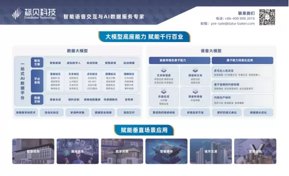 AI数据方面,标贝科技基于高质量的数据采标技术以及丰富的多模态数据资源,为客户打造全方位数据服务方案。包括通用及垂直领域的多模态数据集,以及大模型数据处理技术通用化解决方案,高效解决AI落地场景多样性、复杂性的数据需求。