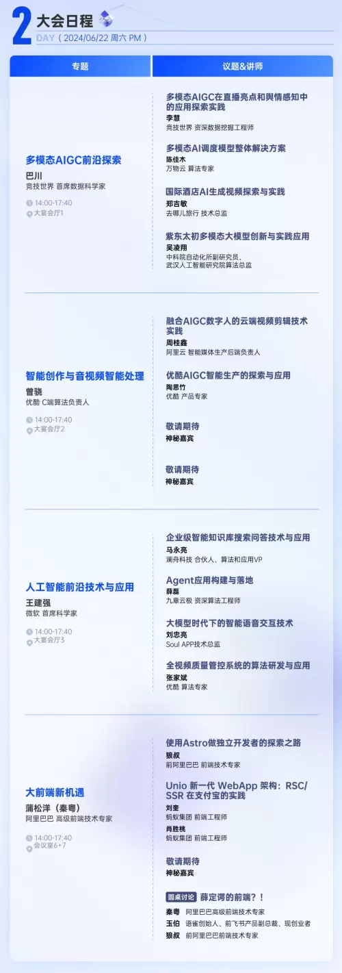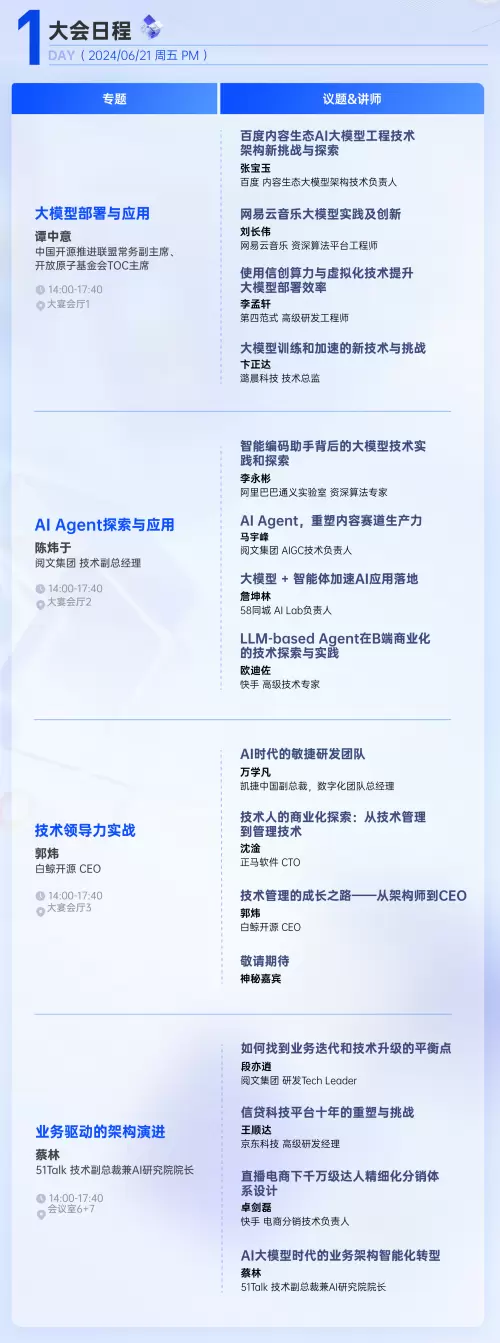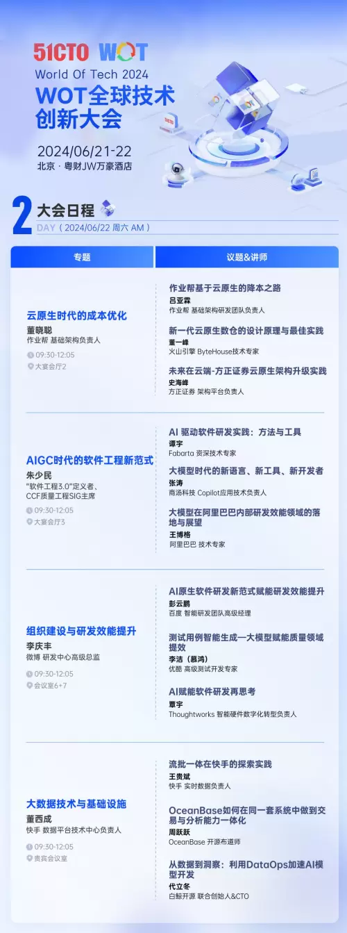 除大模型相关话题外,本届大会还设立了研发效能提升、架构演进、大数据、技术领导力、大前端等多个技术人持续关注的话题方向,邀请京东、51Talk、作业帮、方正证券、阅文集团等企业专家带来精彩分享。