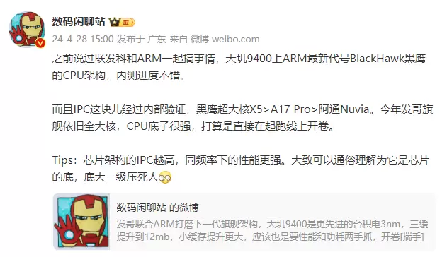 有意思的是,此前数码闲聊站就爆料称,从IPC角度来看,黑鹰架构Cortex-X5比A17 Pro和高通Nuvia都要强,也就是同频率下,天玑9400芯片的黑鹰CPU架构性能是无可匹敌的,“IPC高”就是芯片里的“底大一级压死人”。