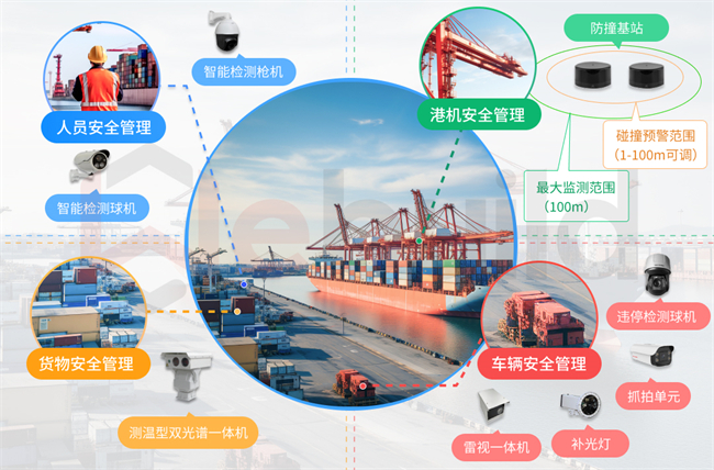 通过AI服务器对人员、港机、集装箱等进行识别分析,包含非法入侵、未带安全帽、疲劳驾驶、港机碰撞、集装箱倾斜等情形。人员识别准确率大于95%,港机、集装箱识别准确率大于90%。同时集成天气系统、消防系统、粉尘检测系统,构建智能化的安全管控体系。