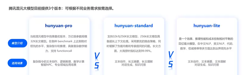 腾讯混元大模型能力持续升级,多个版本模型hunyuan-pro、hunyuan-standard、hunyuan-lite通过腾讯云对外开放,满足企业客户、开发者在不同场景下的模型需求,落地最优性价比模型方案。