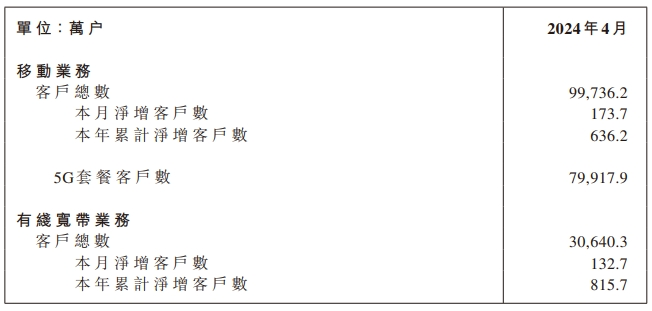 数据显示,2024年4月份,中国移动用户总数达到9.97362亿户,当月净增客户数173.7万户。有线宽带方面,中国移动有线宽带客户总数达到3.06403亿户,当月净增客户数132.7万户。