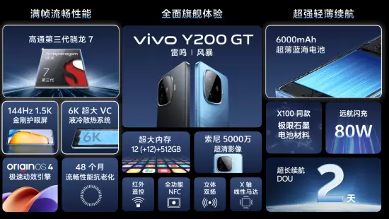 Y200 GT首销至高优惠200元,8G+128G版本首销到手价1499元、8G+256G版本首销到手价1599元、12G+256G版本首销到手价1799元、12G+512G版本首销到手价2099元。